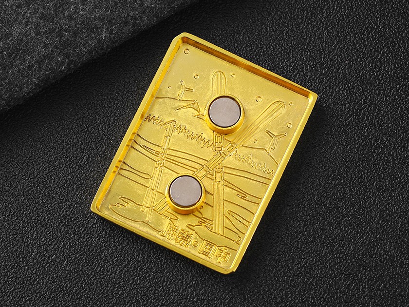 【制作工藝】:沖壓 【上色工藝】:烤漆 【電鍍顏色】:金色 【背面工藝】:金屬凹凸 【產(chǎn)品配件】:磁鐵扣